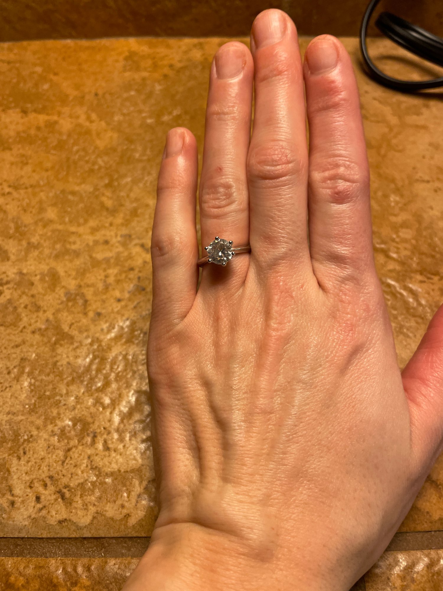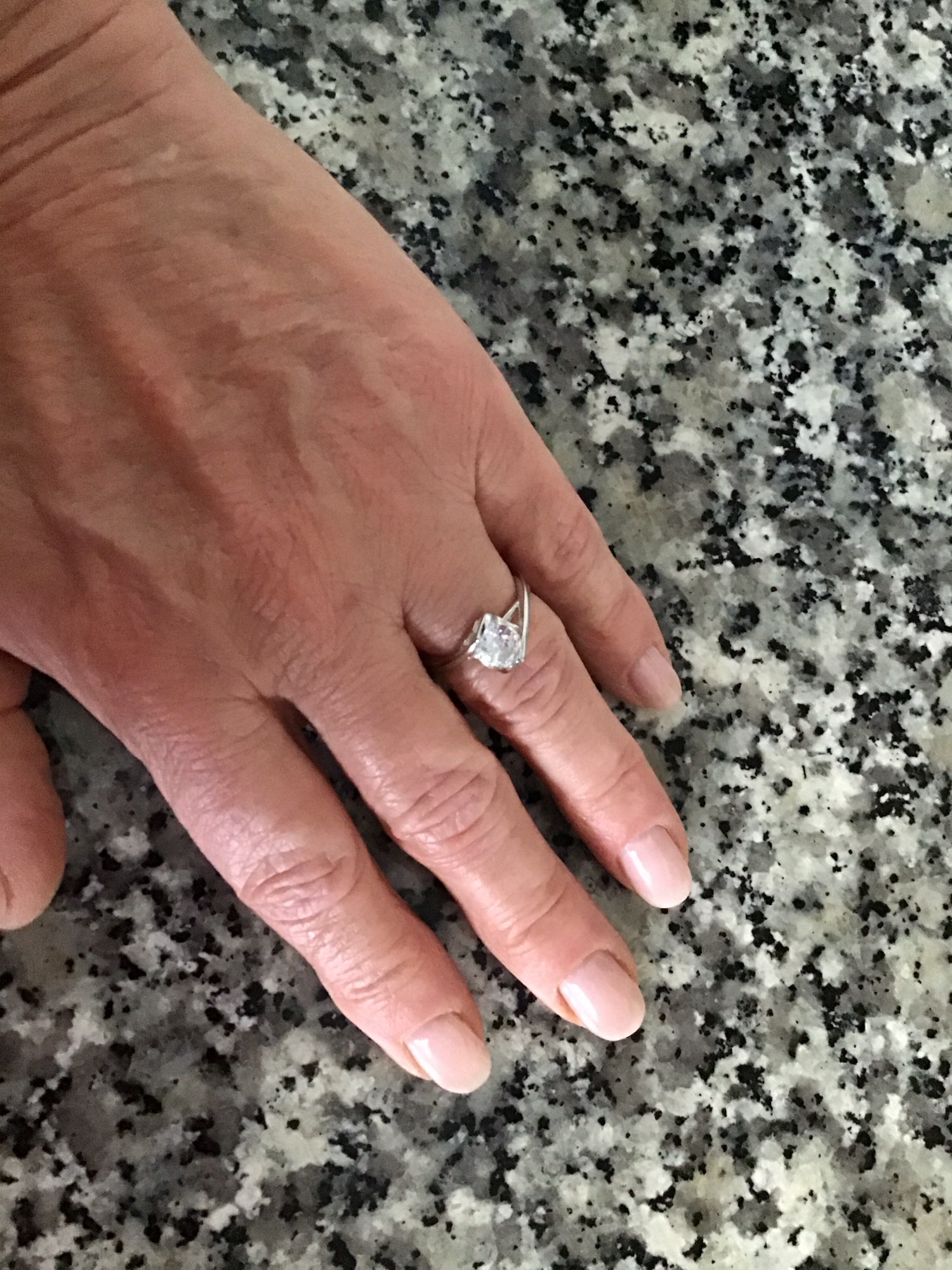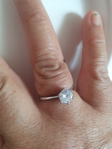 This is a stunning ring. It looks so real is nice to wear so that when I’m out and about I can put this one on instead of my real diamond but this one looks dead on a real diamond and the band is awesome. It stays nice and sharp. It doesn’t look like it’s fading out. It doesn’t change colors. It doesn’t turn your finger green Nothing has changed on it and I have worn it through everything washing rough playing everything nothing has changed on this ring .It’s beautiful.
