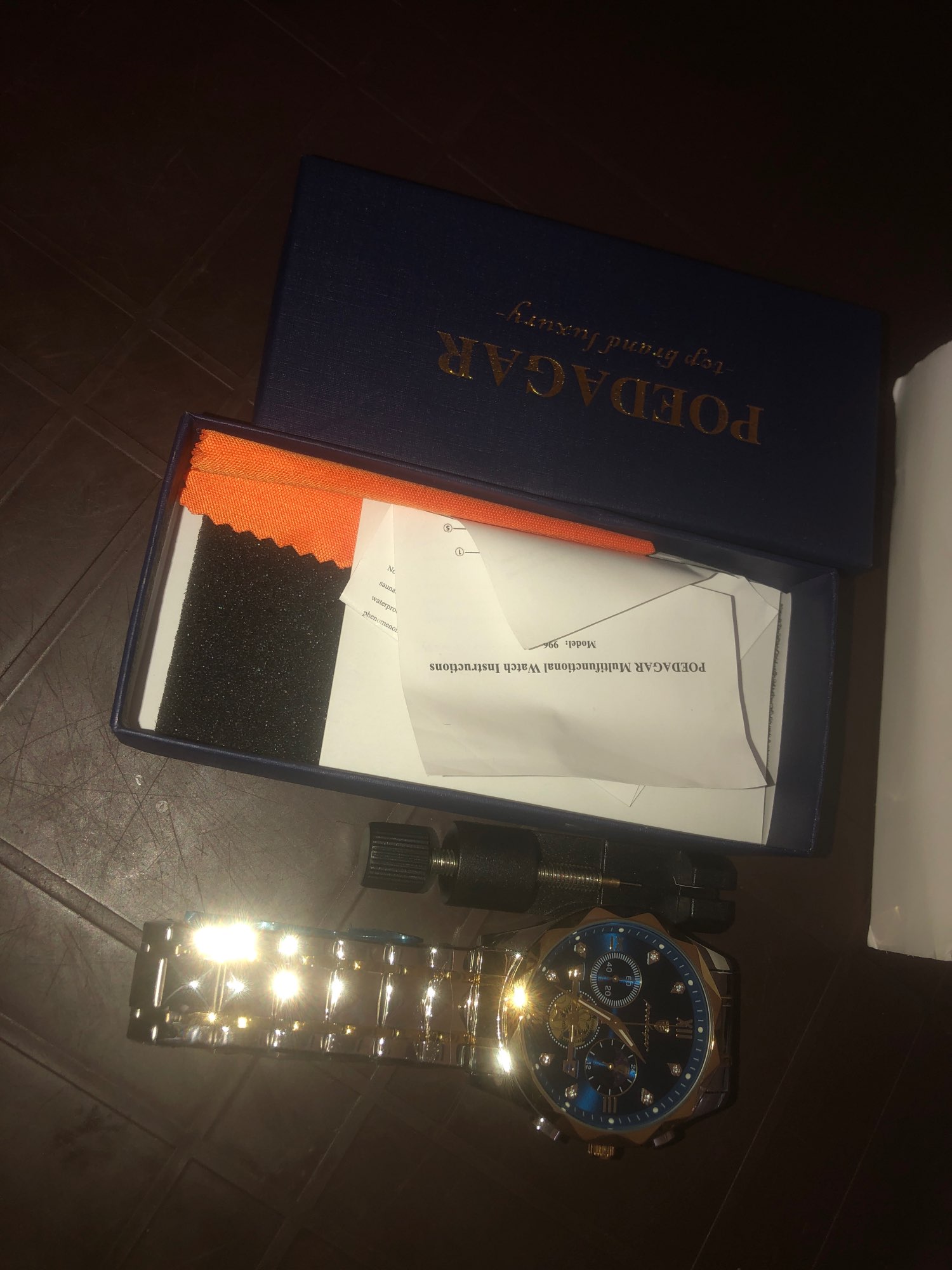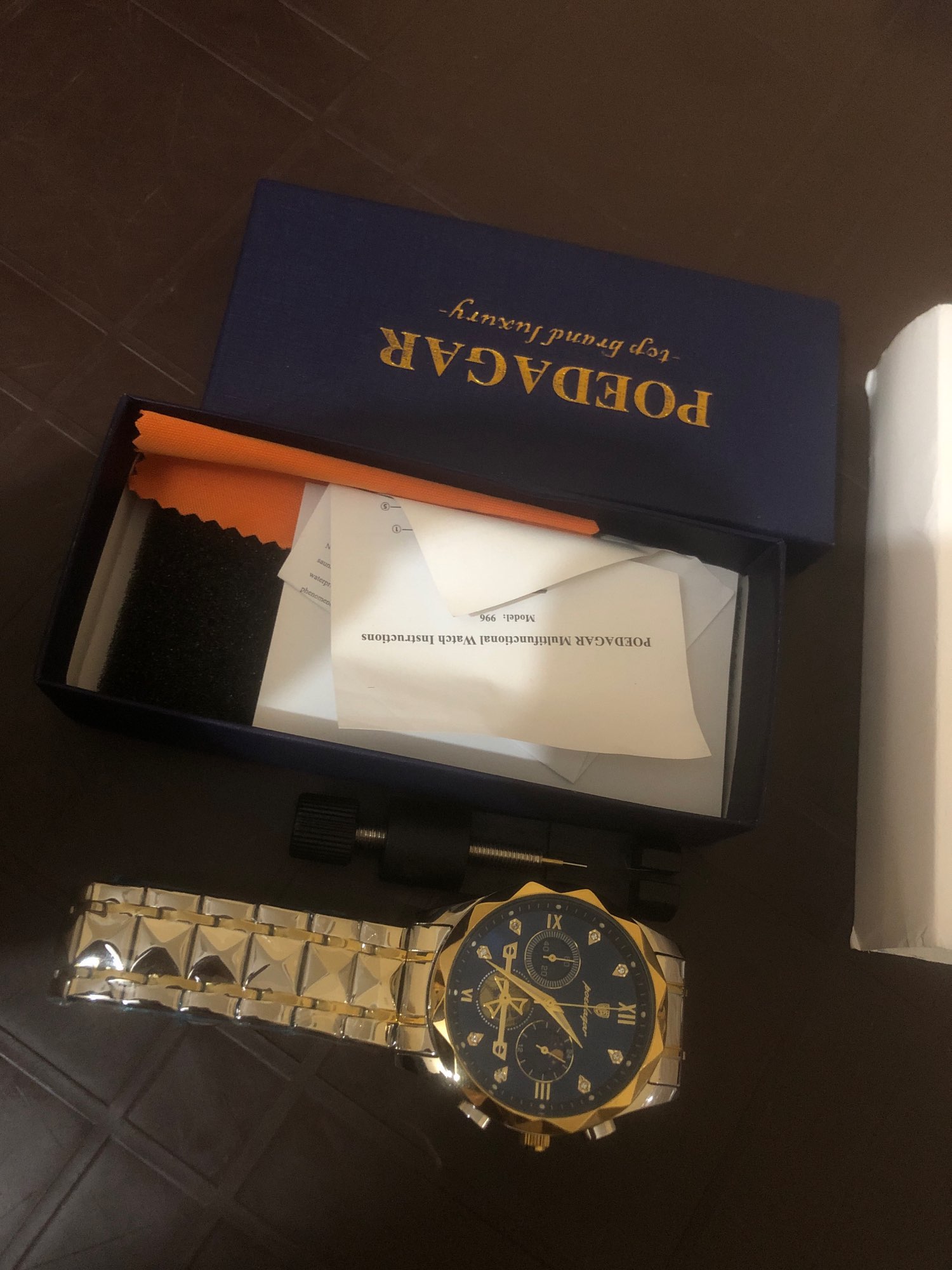 Excellent product, as in the photos, best of all is that it brings your tool for oneself to adjust the watch to size, super recommended, arrived much earlier than expected.